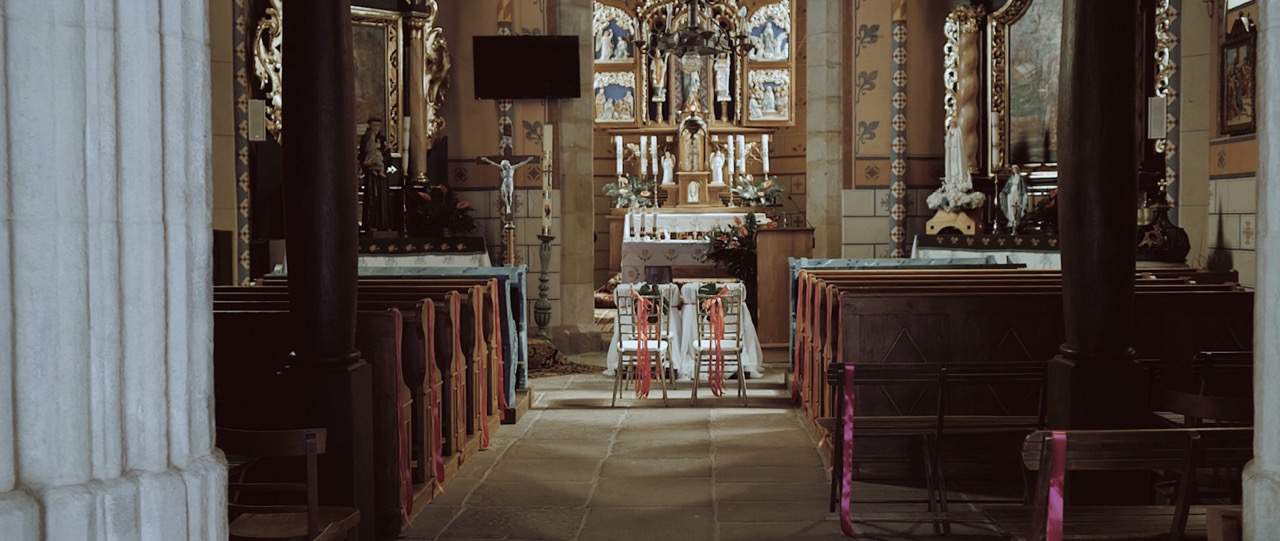 Wewnątrz kaplicy panowała cisza, aż do momentu, gdy do środka wkroczyła piękna panna młoda. Miała na sobie białą suknię, która podkreślała jej kobiece kształty. Jej a w rękach trzymała bukiet kwiatów.