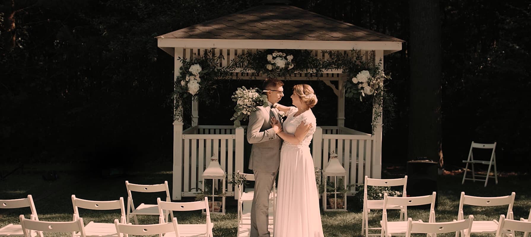 Sylwia i Łukasz zdecydowali się na ślub plenerowy, a na jego miejsce wybrali ogród z urokliwą altaną obok restauracji, w której odbyło się przyjęcie weselne. Białe krzesła, piękna pogoda, idealna przestrzeń na wymarzony dzień ślubu.